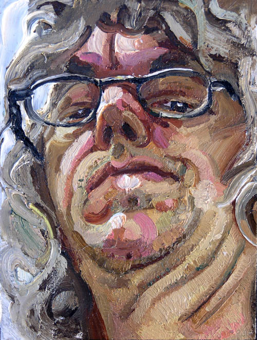 This portrait from an awkward angle I think shows just how much I have learned from the Postcard painting project. It is a small but strong painting.